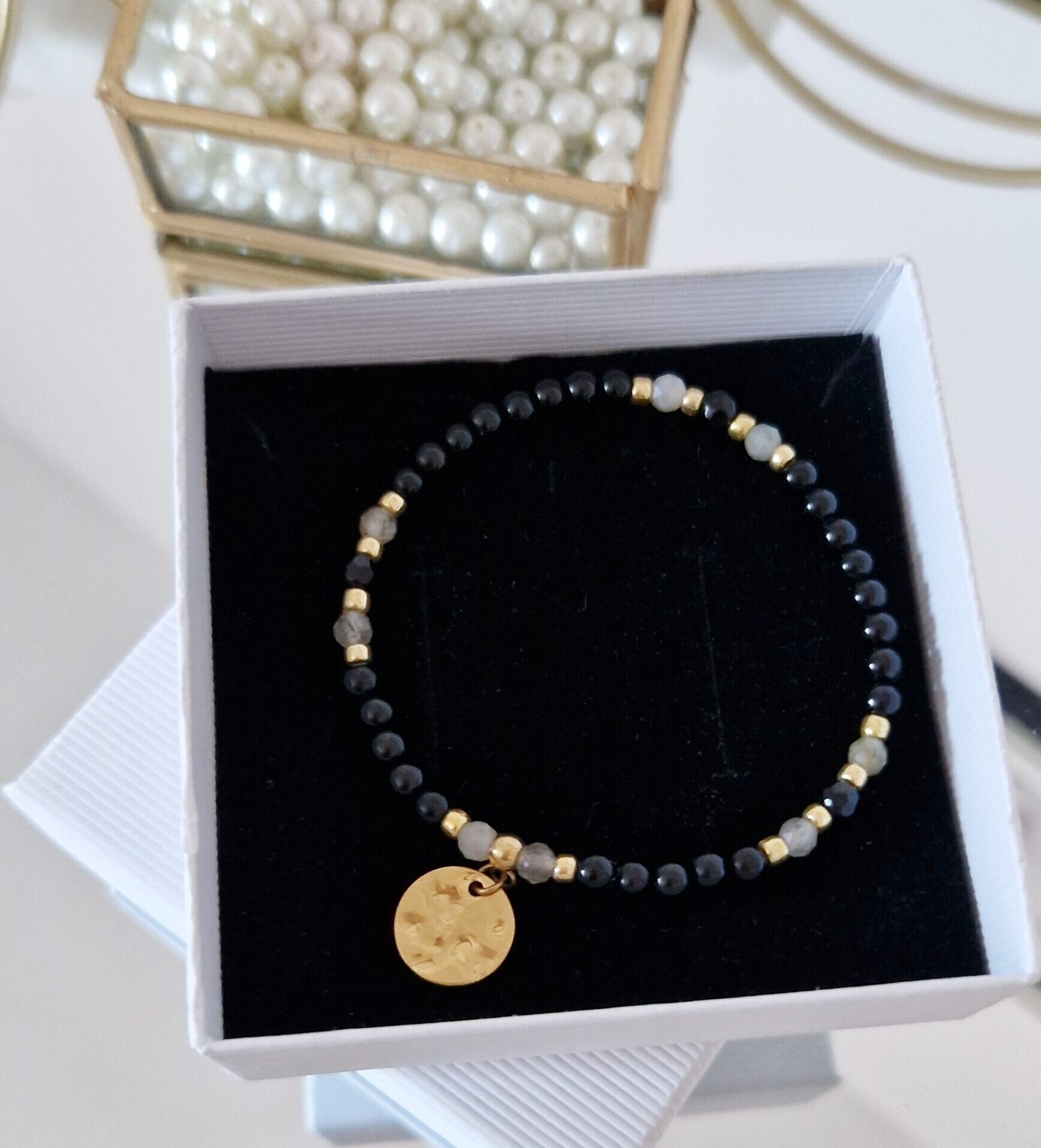 Wykonanie: kamienie naturalne onyks 4mm, kamienie naturalne labradoryt fasetowany 4mm, kamienie naturalne onyks fasetowany 4mm, mocna elastyczna gumka