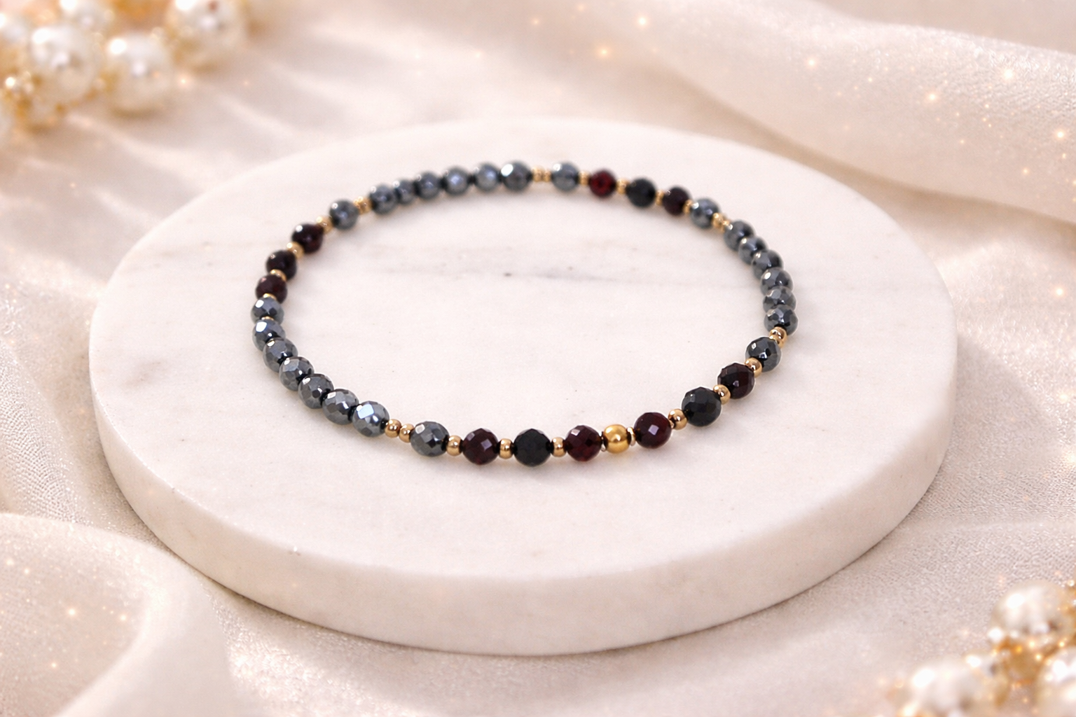 Wykonanie:  hematyt, turmalin, granat, mocna elastyczna gumka