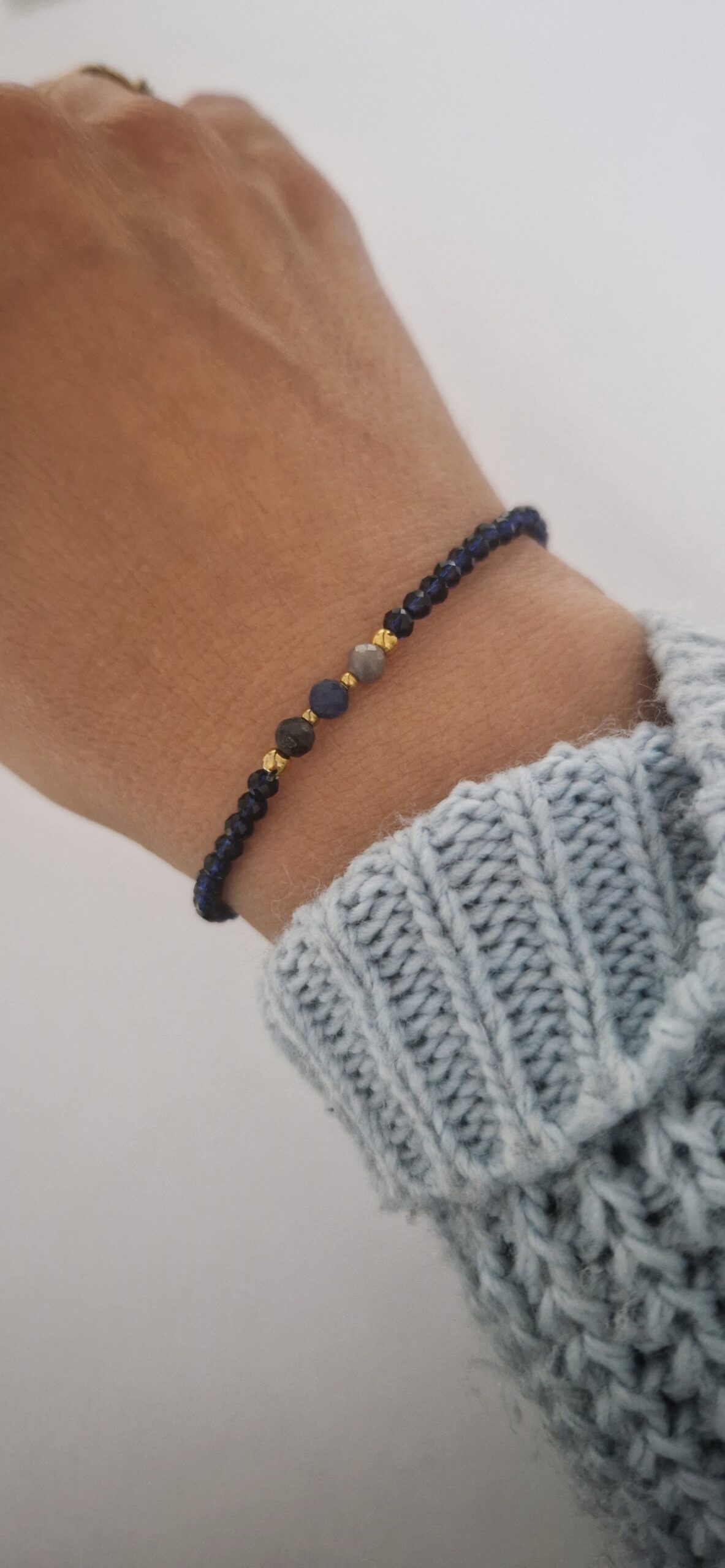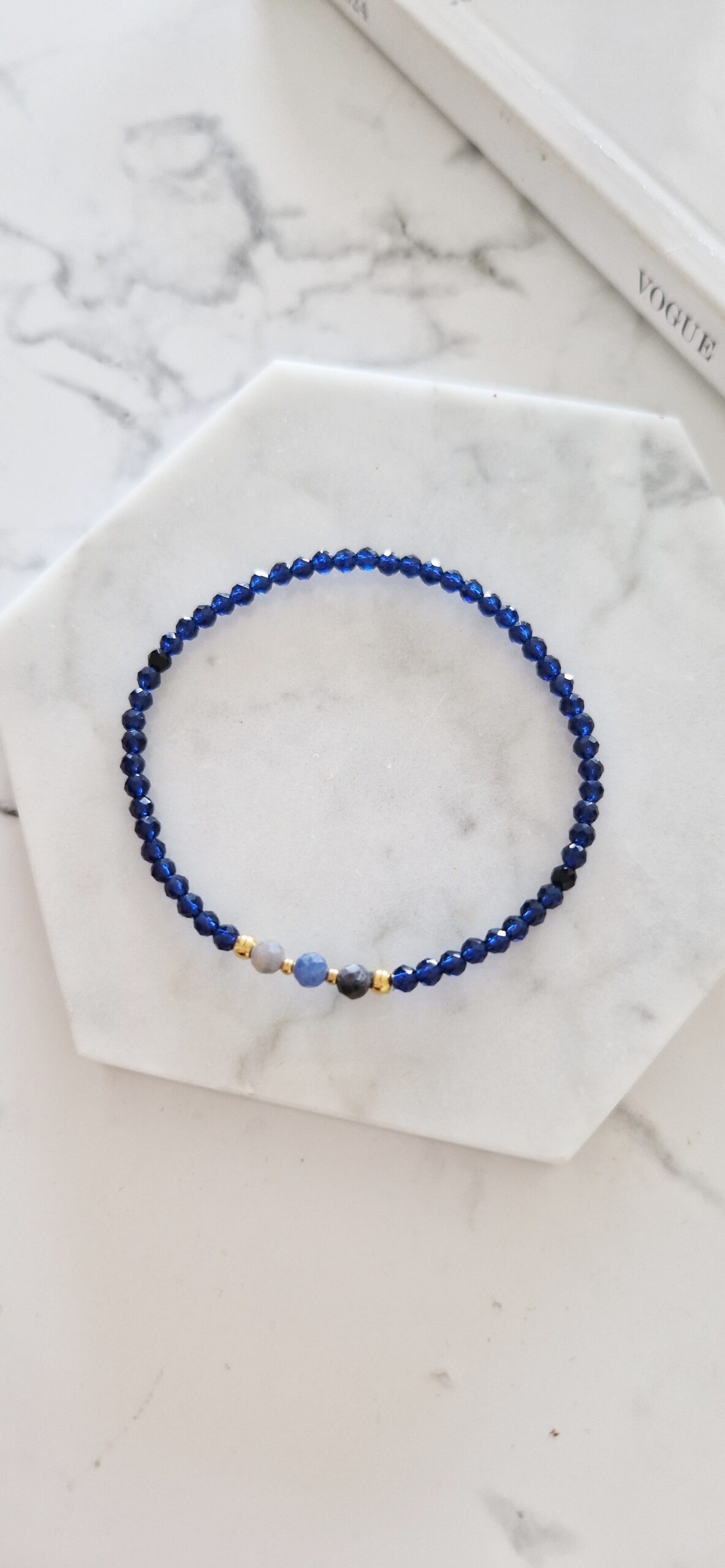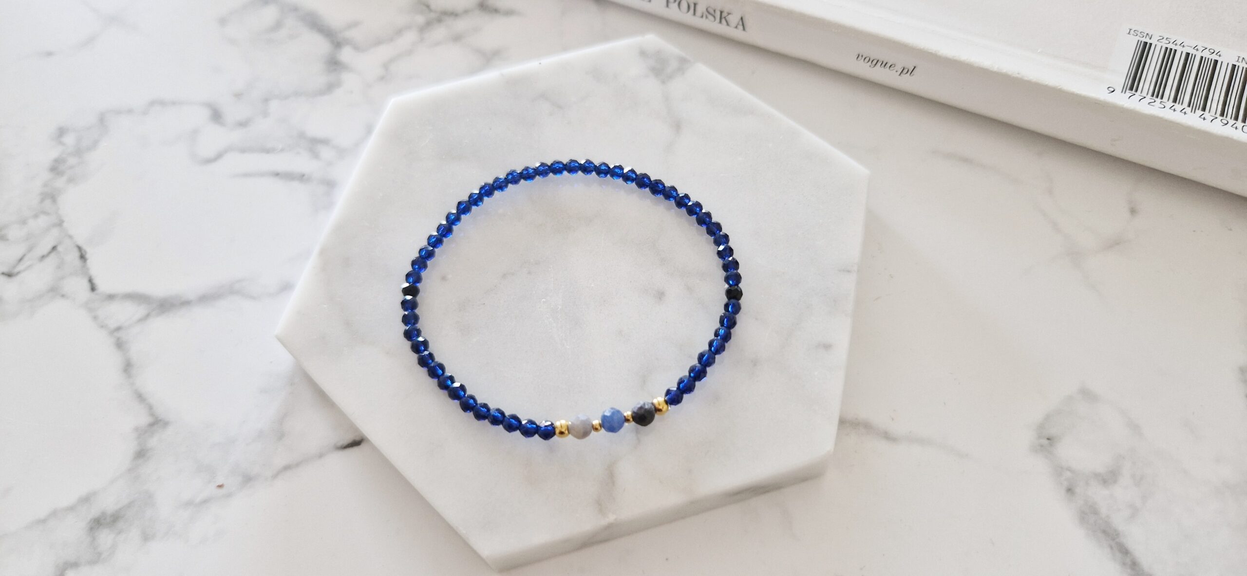 Wykonanie: kamienie naturalne szafir fasetowany 4mm, kamień naturalny sodalit fasetowany 4mm, kamienie szafir klarowany fasetowany 3mm, antyalergiczna stal chirurgiczna, złocona, mocna elastyczna gumka
